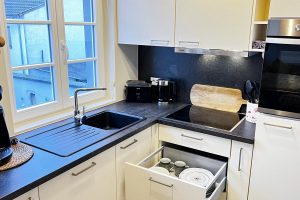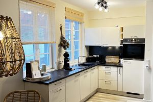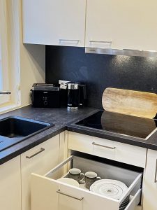 Kleine Erstausstattung vorhanden: Gewürze, Küchenrolle, Zucker, Kaffeepads, Spülmaschinentaps, Geschirrtücher, Reinigungsutensilien, WC Papier
