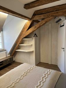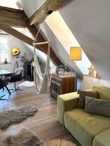 In unserem „Industrial Loft“ im Dachgeschoss ergänzen sich „alt“ und „modern“ zu einem wunderschönen Ambiente. Auf rund 75 Quadratmetern erwarten Sie eine offene Wohnküche mit großem Esstisch, eine große Schlafcouch, die genügend Platz für 2 Personen bietet. Den kompletten Wohnbereich können Sie mit Jalousien abdunkeln. Zudem gibt es ein Schlafzimmer, ein Badezimmer und ein separates WC. Die Wohnung ist mit einer Klimaanlage ausgestattet. Im Innenhof befindet sich ein PKW Stellplatz mit Unterstellmöglichkeiten für Fahrräder.